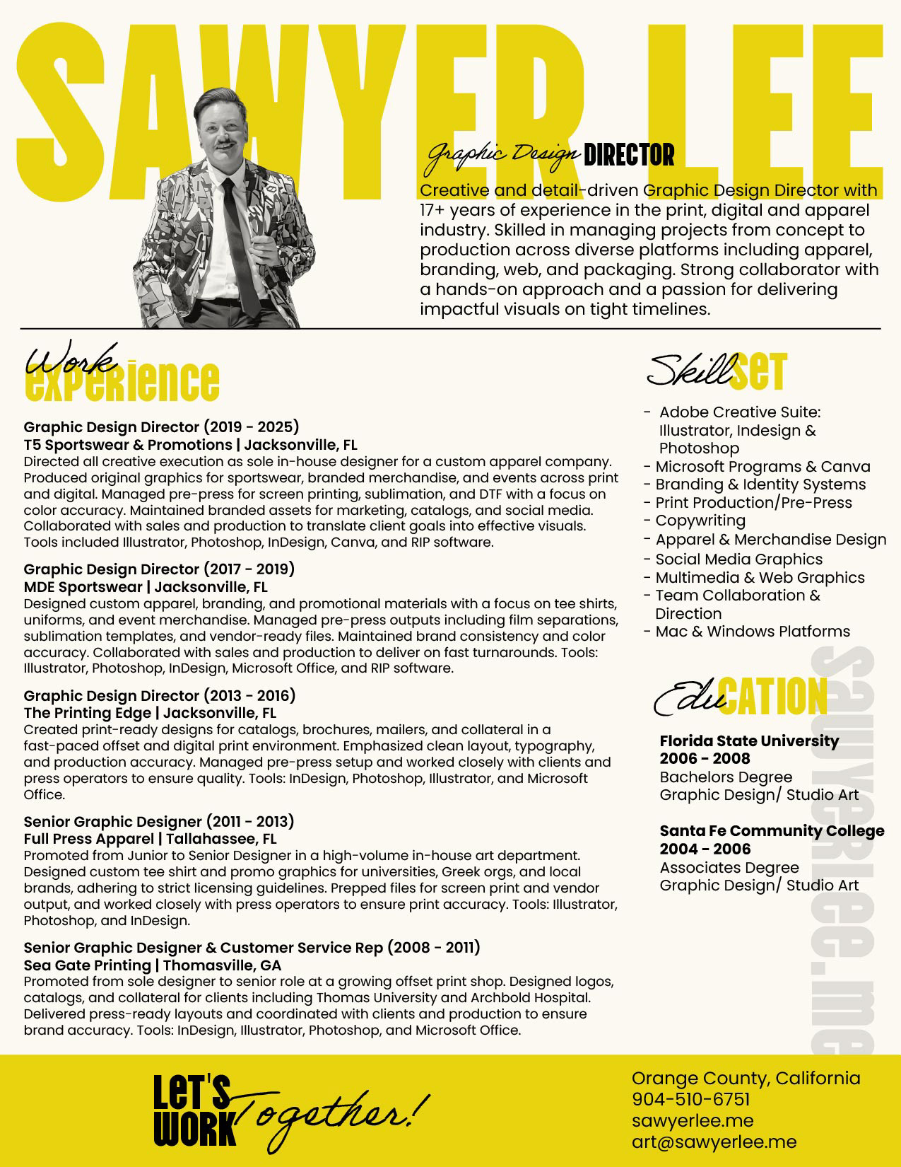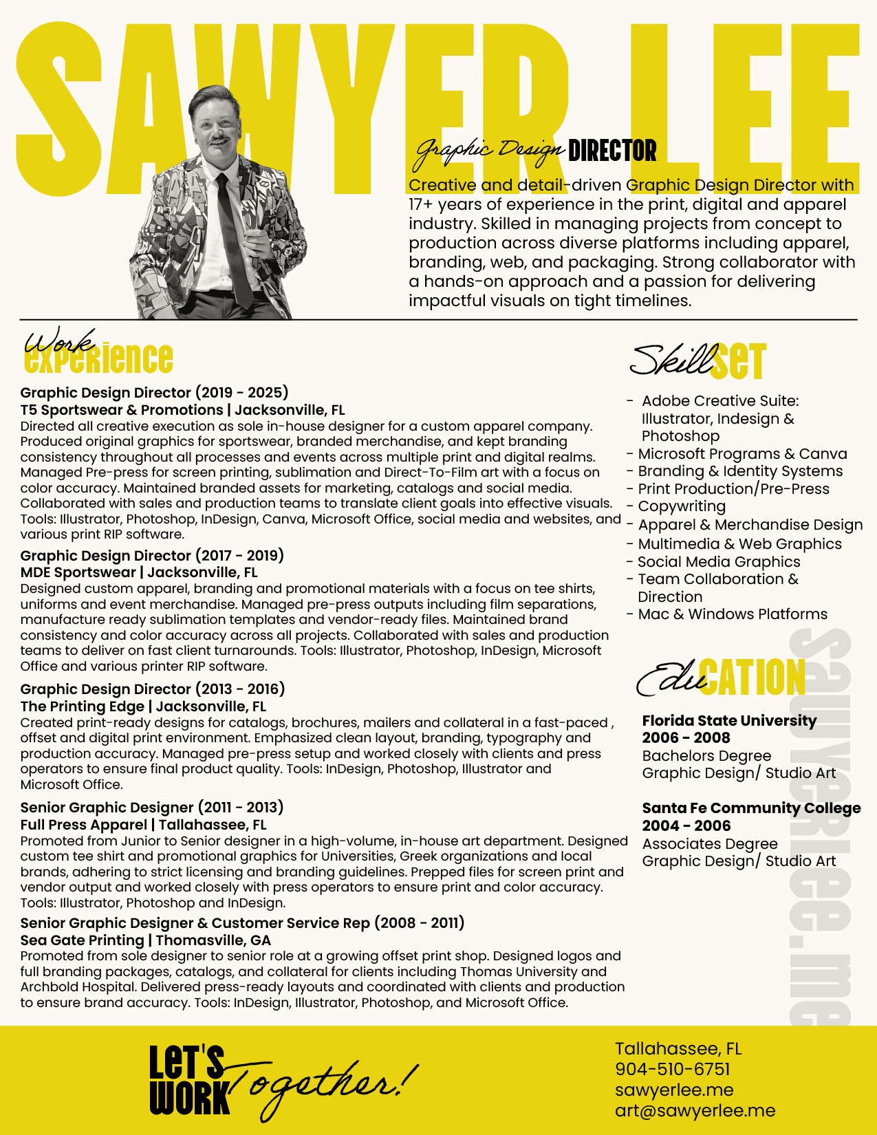 Graduating with a B.A. in Graphic Design from Florida State University in 2008 (with a fine art foundation), I’ve spent my career translating big ideas into bold, impactful visuals, from commercial print campaigns to custom apparel lines, social media graphics, packaging, and everything in between. I've led fast-paced creative departments and thrived as both a team leader and a one-person powerhouse, often serving as the Senior or sole designer on staff. From concept to completion, quality, speed and adaptability are non-negotiable.